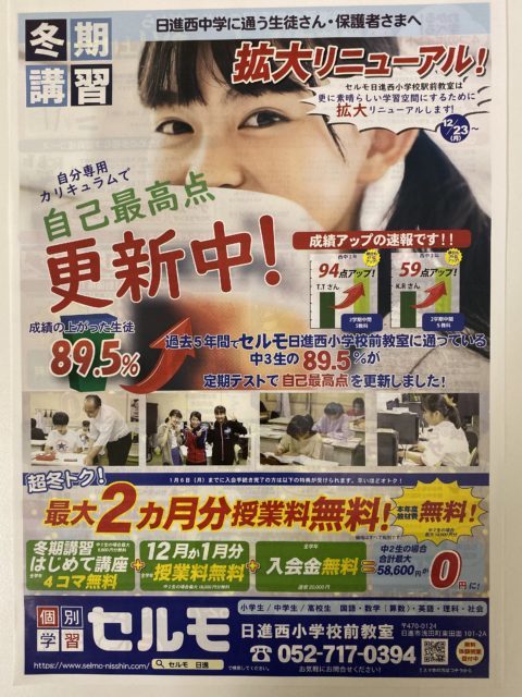 今週の火曜日より、日進西中の通学エリアの中で、西小と赤池小のエリアを中心に、折込広告を入れさせていただきました。