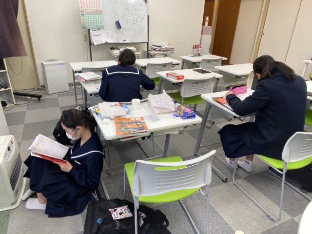 教室内がなかなか温まらないので、ストーブの前で勉強する女子3人組