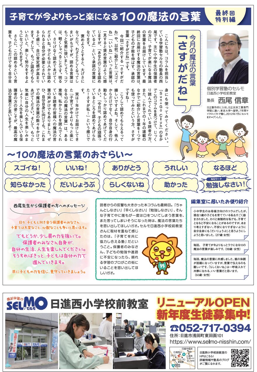 こんにちは。コラムを担当している学習塾セルモの塾長の西尾です。主に小中学生のお母さま方に、子育てが楽になる魔法の言葉をお届けしています。最終回にお届けする魔法の言葉は、こどもの才能を伸ばす、承認の言葉「さすがだね」です。