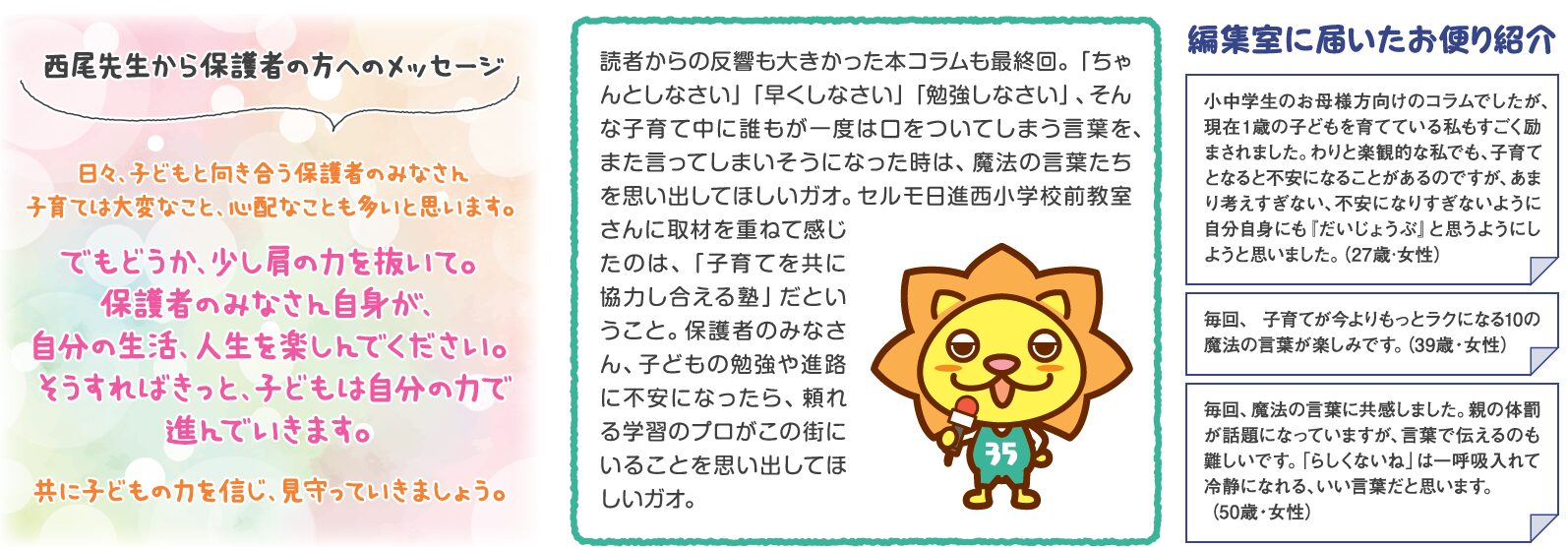いつものコラムの欄の下には最後に改めて読者のお母さま方に私からのメッセージと、リポーターのさんごくんからのコメントを頂いています!