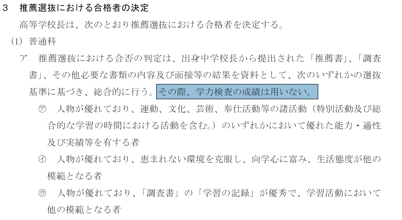 推薦の合否は、推薦書と面接のみで、学力テストの成績は用いないとはっきり書いてありますね。
