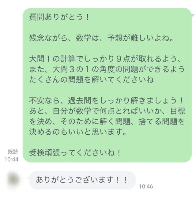 この土日で、「わらをもすがる思い」(意味わかります?)で頑張ってる受験生からの相談だったので、今回は丁寧にお返事させていただきましたが、基本、こちらのLINEはこうした質問用ではないことをご了承くださいね。