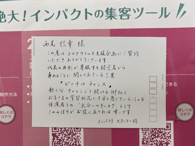 この「のぼり」は、塾の集客のプロである、福岡にある「インパクト」いう会社の井形社長の発案で作られ、なれないオンライン授業に乗り出した学習塾を集客面で応援すべく無償で送っていただけたものです。