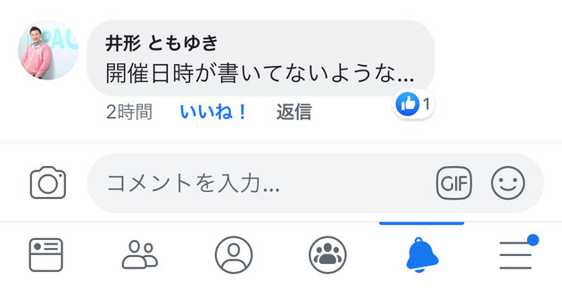 そう、開催日時が書いていないチラシを配ってしまったことがあり、そのチラシをFacebookでみた井形社長がコメントで指摘してくれたんですよね。