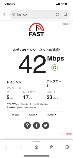 ちなにみ、有線LANでスピードを図ると、こんな感じです。