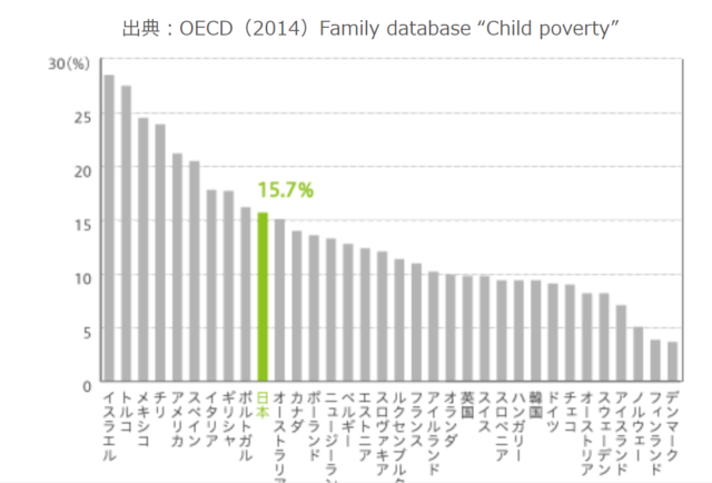実は、17歳以下の子供の相対的貧困率は、日本はOECD34か国中10位で、子どもの約7人に1人が貧困というデータがあります。