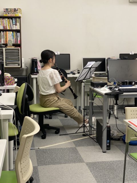 教室の向こうのほうでは、卒塾生がクラリネットの練習をしています。