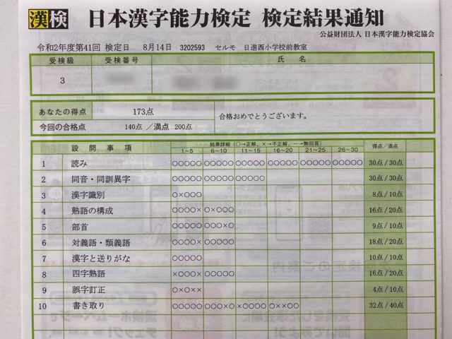 高1生がリベンジ受験した漢検CBT受験の結果が届きました!