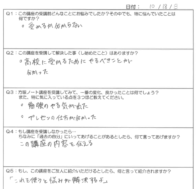 アンケートのお悩みの欄には、受験生らしく、「受かるかどうか分からない」と書いていますが、受講後には、「やるべきことがわかった」と大きく気持ちが変わっているのがよくわかります!