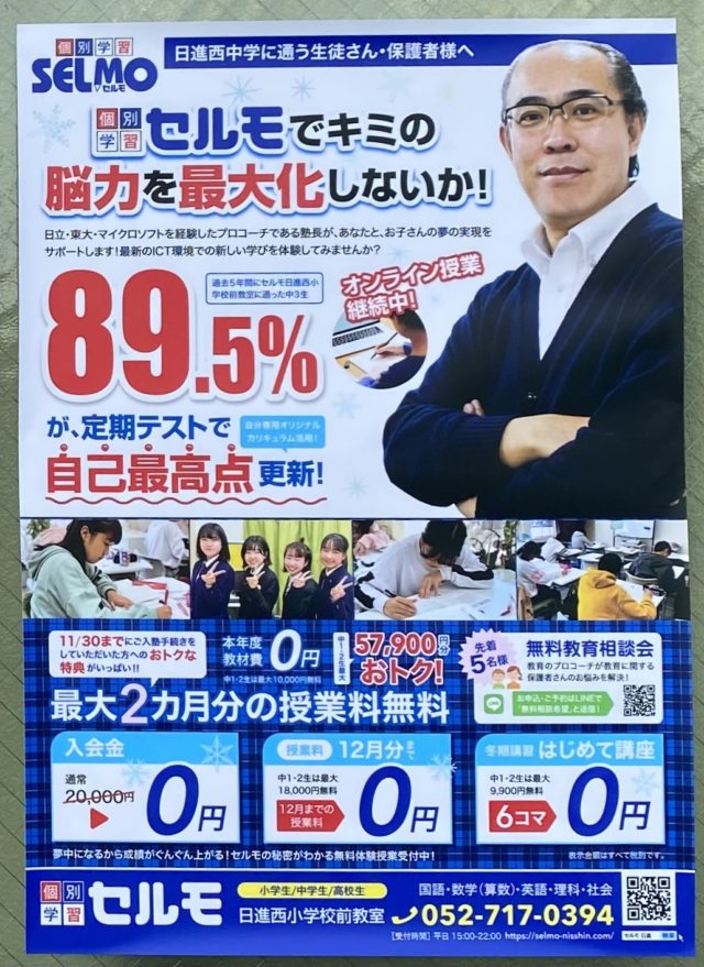 日進市で、主に日進西中学校の生徒を中心に、生徒みずから主体性を持って学び、自分のペースで勉強できる、ICTを活用した自立学習による学びの場を提供している、セルモ日進西小学校前教室 塾長の西尾です。