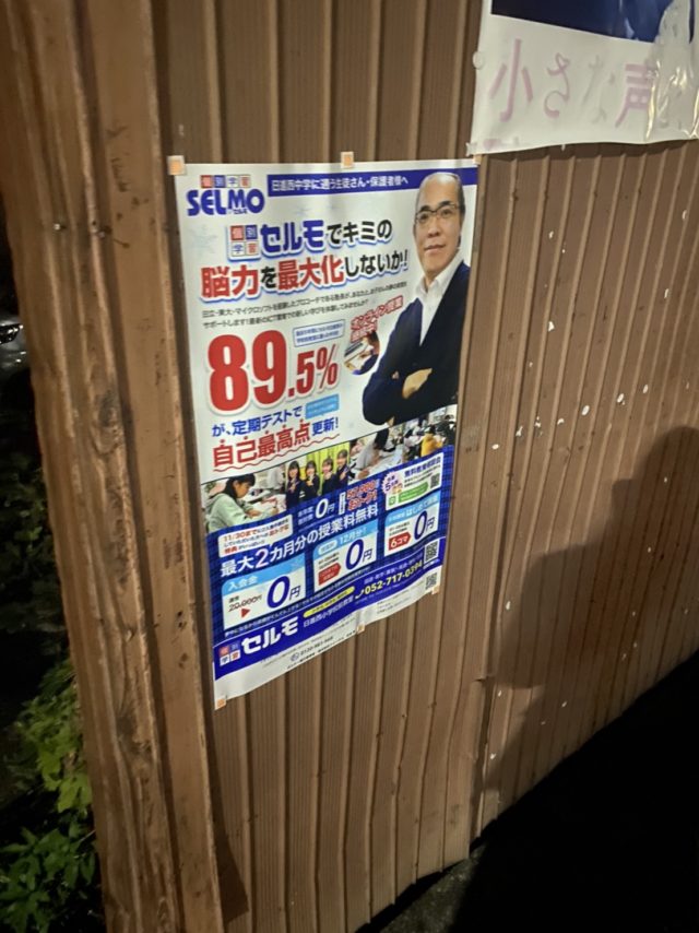 あと、通学路になっているガソリンスタンドの壁面に貼られているポスター、生徒が見つけたときは、「塾長と目が合ったと思ってビックリしたらポスターだった!」ってお母さんに話をしてくれたそうです。