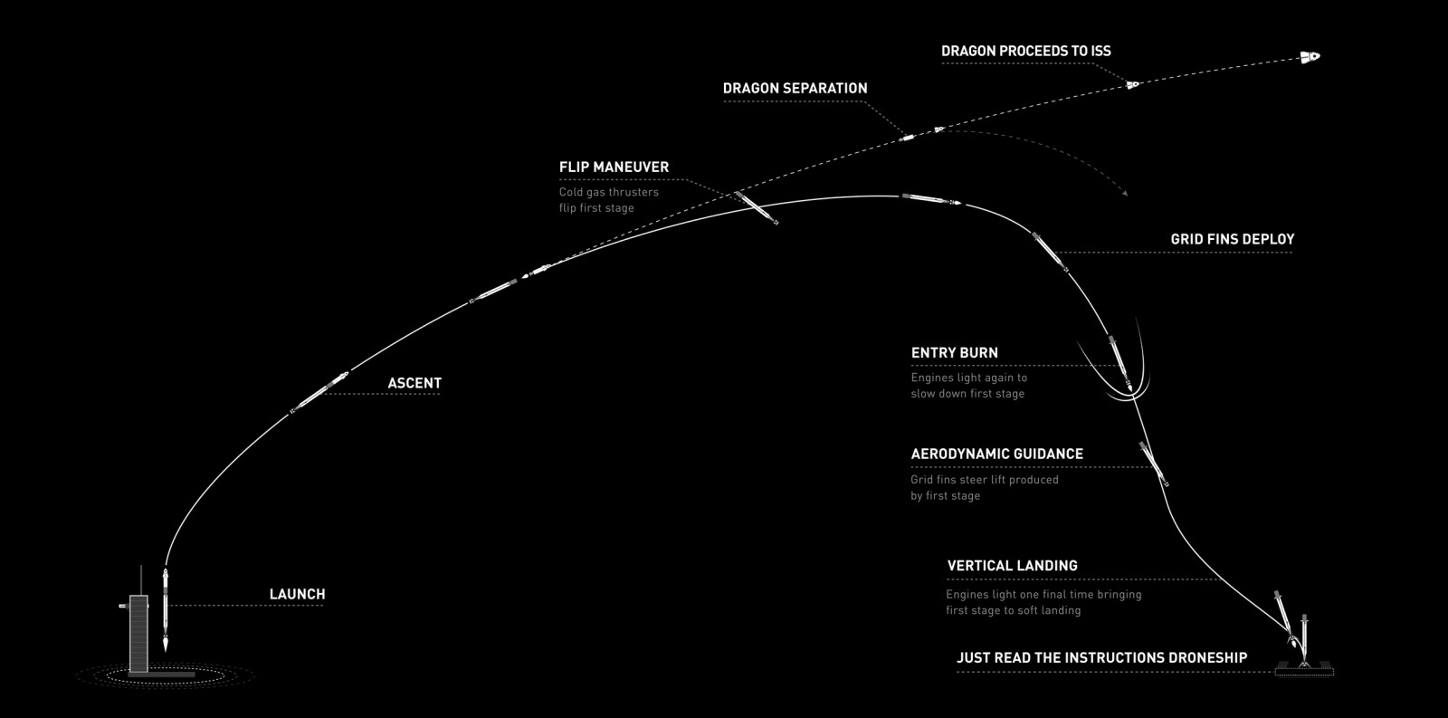 こちらは、今回のロケット発射の流れですが、よく見ると、打ち上げに使ったロケットの1段目が、地上に帰ってきているのがわかるかと思います。