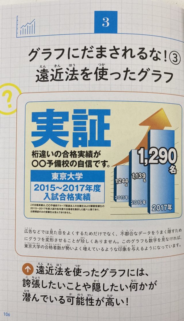 他にも、グラフの作り方、選び方、データから問題を発見して解決するまでの手法など、多くのためになることが、小中学生にもわかるように書かれている、とてもいい本だと思います。