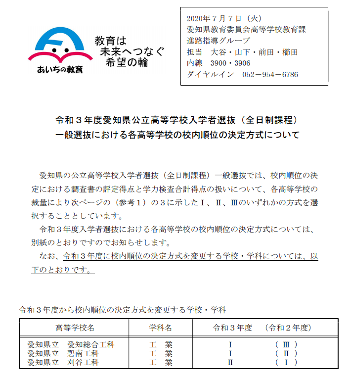 令和3年度愛知県公立高校入試 一般選抜における各高等学校の校内順位の決定方法が発表されました!