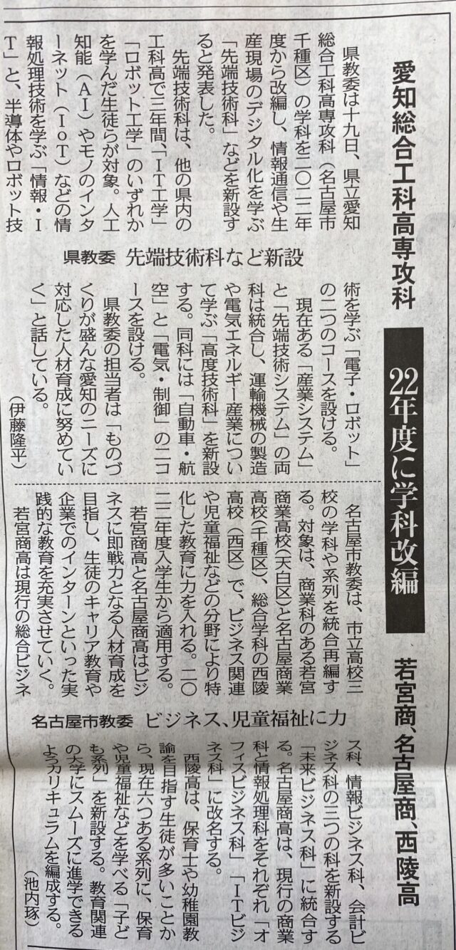 今日は、今朝の新聞に紹介されていた、商業高校の学科改編、学科名称変更についてご紹介します。