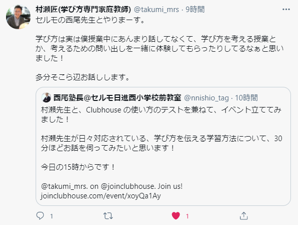 すると、塾長仲間(正確には塾長ではなく、家庭教師ですがw)の村瀬さんが、やはり、ライブ放送をやりたいからだれか一緒にやろうと相方を探してるのを見つけ、12時過ぎに、お声がけし、速攻話をまとめ、3時にライブ放送を開始することになりました!