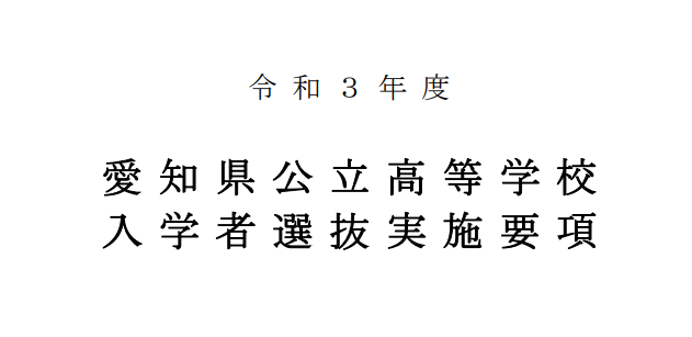上記リンク先に、愛知県教育委員会が発行している「愛知県公立高等学校入学者選抜実施要項」があります。