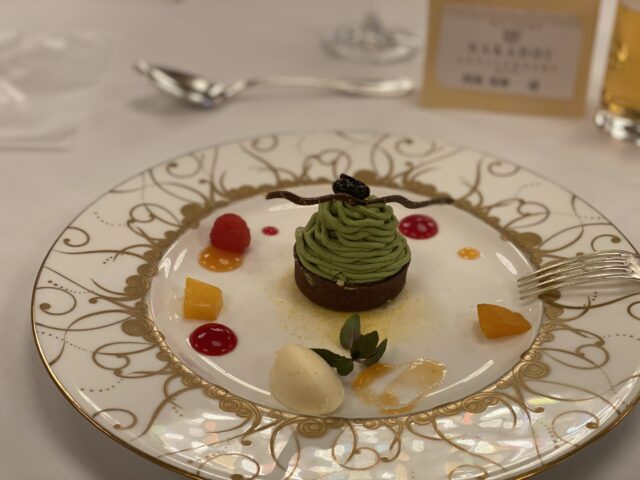 抹茶のモンブランタルト仕立て ジョコラブランのムースを添えて