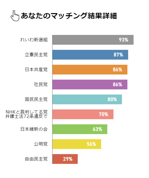ここには、20個の質問が置かれており、それらについて、自分の考えを答えていくと、最後に、自分の考えと、どこの政党が一番マッチングしているか、他の政党とのマッチング率はどれくらいかをグラフで表してくれます。