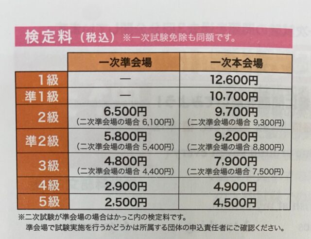 以下の価格表の通り、どの級でも、価格差が3,000円前後あり、準会場である当塾で受験するほうがお得なので、受験を考えている方は、ぜひ当塾での受験を検討ください。