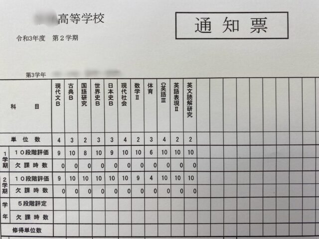 進学コース1位は逃したものの、クラス1位、そして、進学コース2位の個票と、10段階評価の10が8教科もずらっと並んだ通知表を見せてくれました。