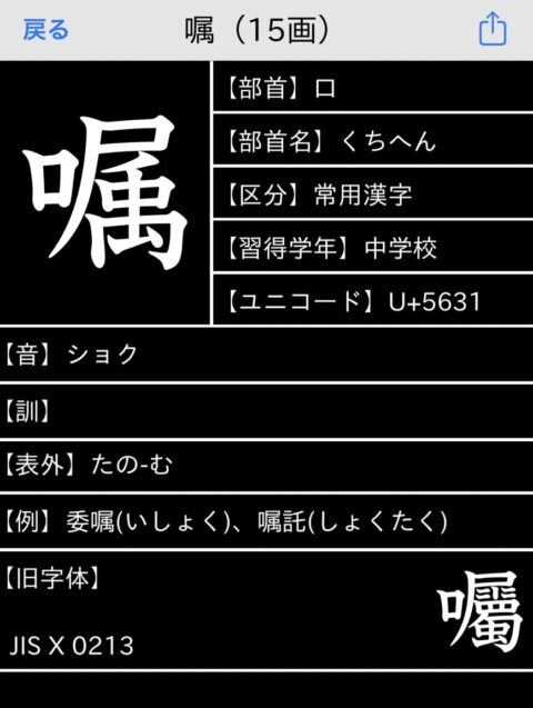 そして詳細を確認すると、部首や、音読み、訓読み、など、いろいろな情報がわかります。