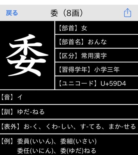 「委」の字を調べると、委(ゆだ)ねるという読み、意味があることがわかります。