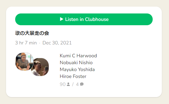 そして、最後はClubhouseでこの1年お世話になったMayukoさん、Kumiさんと3人で歌の忘年会でした(笑)