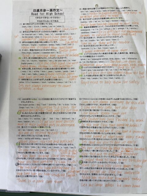 プリントの内容は、テスト範囲の教科書の日本語訳をもとに、英語に戻すものです。