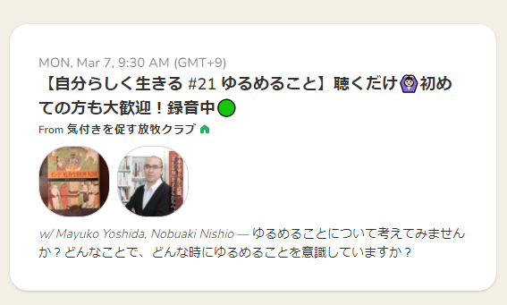 昨日は月曜恒例のClubhouseのコーチング部屋でした。「ゆるめること」についてみんなで考えました!