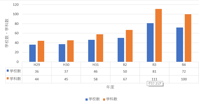 まずは、定員割れした学校数と学科数の推移です。
