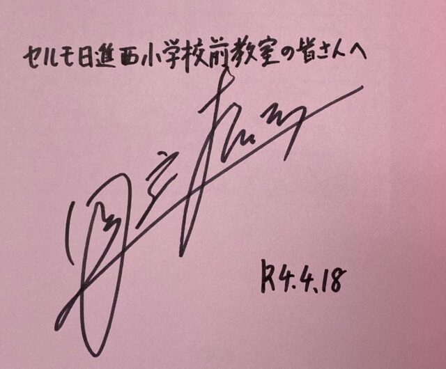 その後、生徒たちにプレゼントするための本にも、サインをお願いしました。