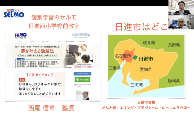 日進市で、主に日進西中学校の生徒を中心に、生徒みずから主体性を持って学び、自分のペースで勉強できる、ICTを活用した自立学習による学びの場を提供している、セルモ日進西小学校前教室 塾長の西尾です。