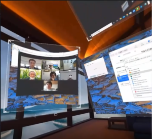 ご覧のように、私を含め4人がアバターとなって会議室の中に、セットアップが間に合わなかった2人が映像の形で会議に参加しています。