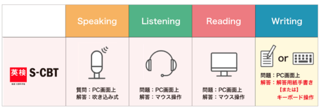 英検S-CBT受験は以下の通り、PCから出題される4技能全ての問題に対し、PCを使って解答していく試験方式です。