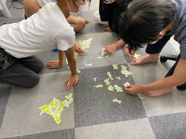 社会では、日本の地理について復習する際に、まずは、実際の都道府県の大きさの比較や、位置関係、地理的な特徴などを体感してもらうために、日本地図パズルを組み立ててもらいました。