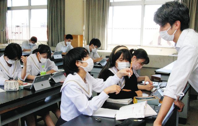 ある日の一年の「現代の国語」。生徒は評論を読んで学んだことをタブレットで入力フォームに書き込んだ。送信するとクラス全員が読める。ACE一期生の大窪のぞみ教諭(34)は「先生がいいねと思った意見はピンク色に塗ります。友達の回答も参考にしてね」と画面上で印を付けていった。