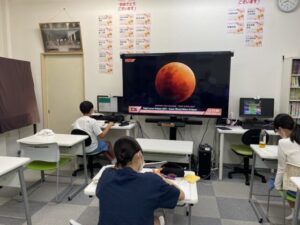 教室内でも大画面でLIVE中継を映しつつ、外で刻々と欠けていく月を生徒たちは、直接見に行くなどして楽しんでくれました。