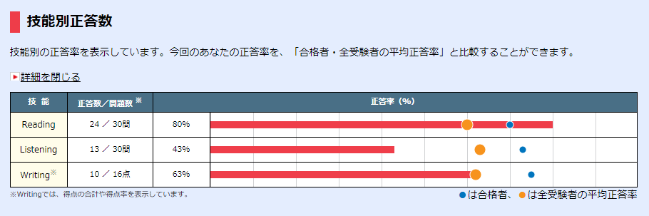 英検の一次試験の合格発表がありました! こんなにバランスが悪くても合格できるんですね。