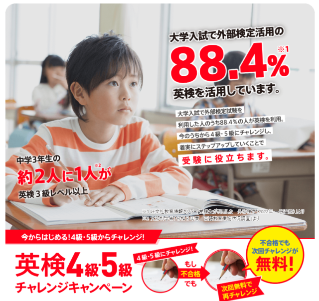 英検の申込受付開始です! 今回も4級は不合格でも無料で再チャレンジできる特典付!
