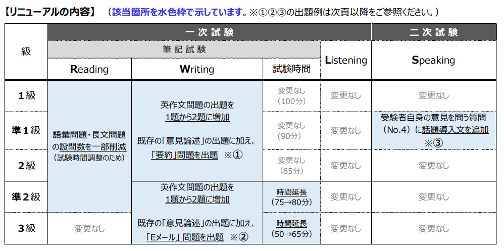 具体的には、ライティング問題が2題になり、準2級と3級には、「Eメール」の返事を書く問題が、1級、準1級、2級には、要約問題が追加となります。