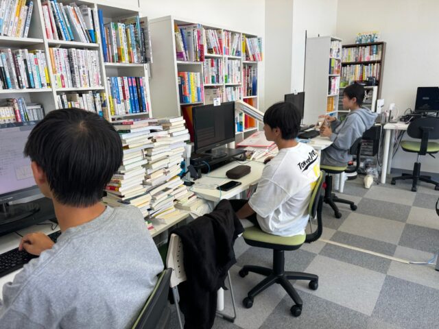 普段は、スクール形式ですが、今日は、PCを使ったシステムでの演習中心なので、みんなPCに向かって、テスト範囲の単元の問題にできるだ多く挑戦し、現時点での自分の理解度を把握してもらい、各教科ごとに、どの分野をより重点的に勉強すべきかを考えてもらいます。