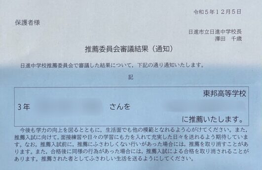 日進中学校 推薦委員会の審議結果の通知がありました!(私立高校編)