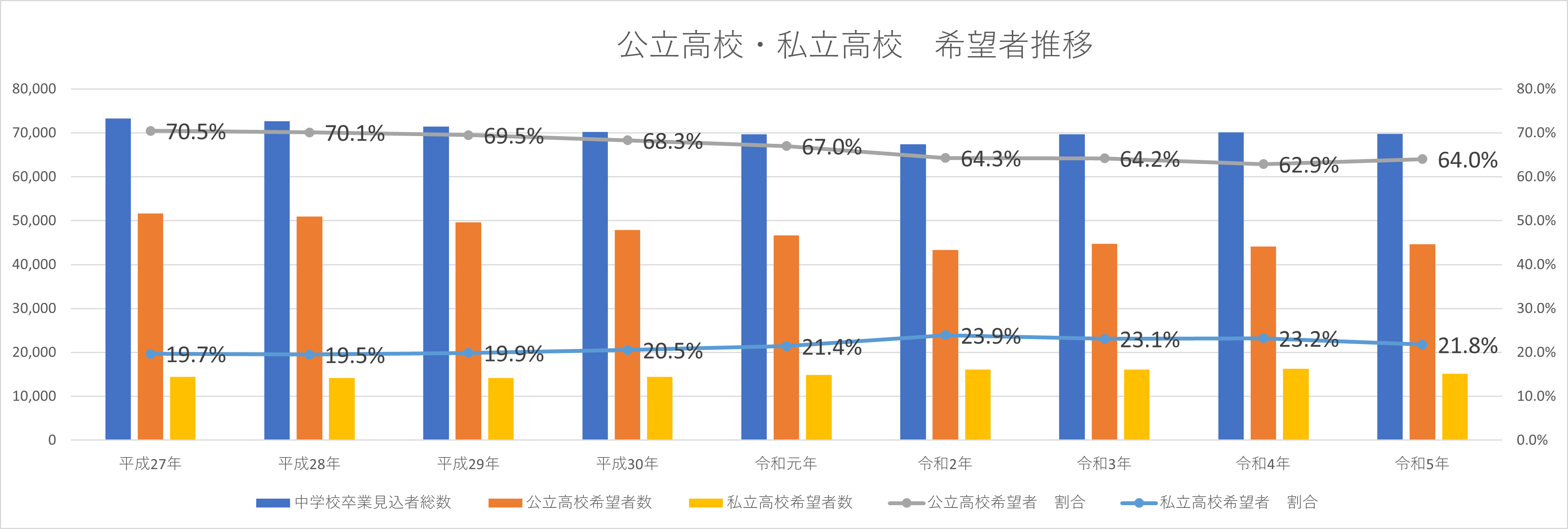 率にすると1.1%の増加ですが、過去一貫して公立高校希望者が下がり続けてきた現状を考えると公立高校離れにも少しだけブレーキが掛かったようにみえます。