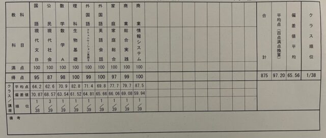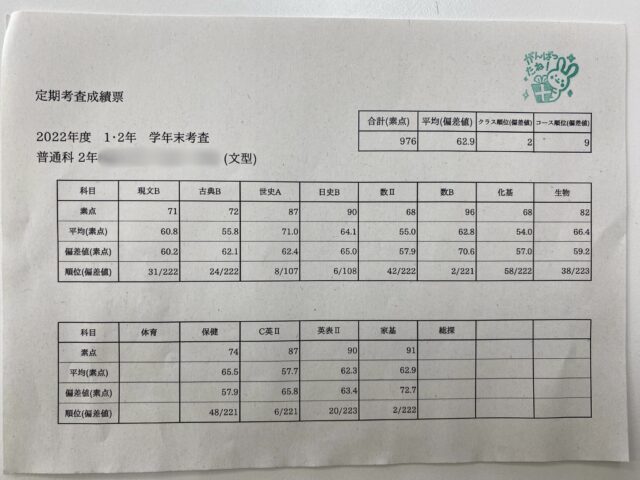 高校生が学年末テストの個票を見せてくれました! 文系コースで9位です!