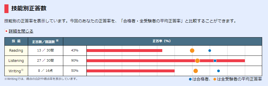 英検の一次試験の合格発表がありました! こんなにバランスが悪くても合格できるんですね。