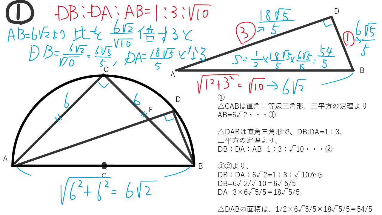 △CABは直角二等辺三角形、三平方の定理よりAB=6√2・・・①