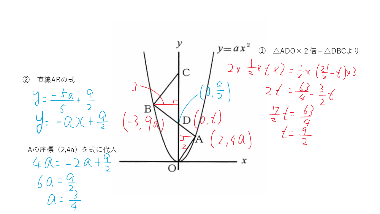 そして、そこから直線ABの式を、aを使って求め、放物線との交点のAのx座標=2を代入してaを求める。