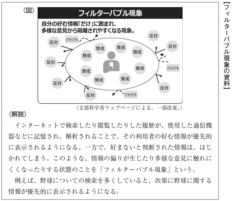 今年の中学3年の国語に、「フィルターバブル現象」について考えてもらう問題がありました。