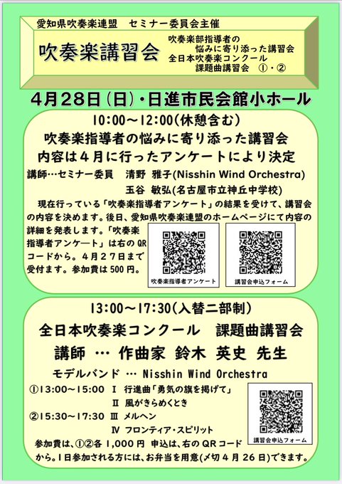自分は、吹奏楽に関しては、ただの演奏者でしかないので、本来はこうした指導者セミナーとは無縁なんですが、モデルバンドがNisshin Wind Orchestra であること、愛知県の吹奏楽指導者のトップのお二人のお話を聞ける機会であることから、参加させていただきました。